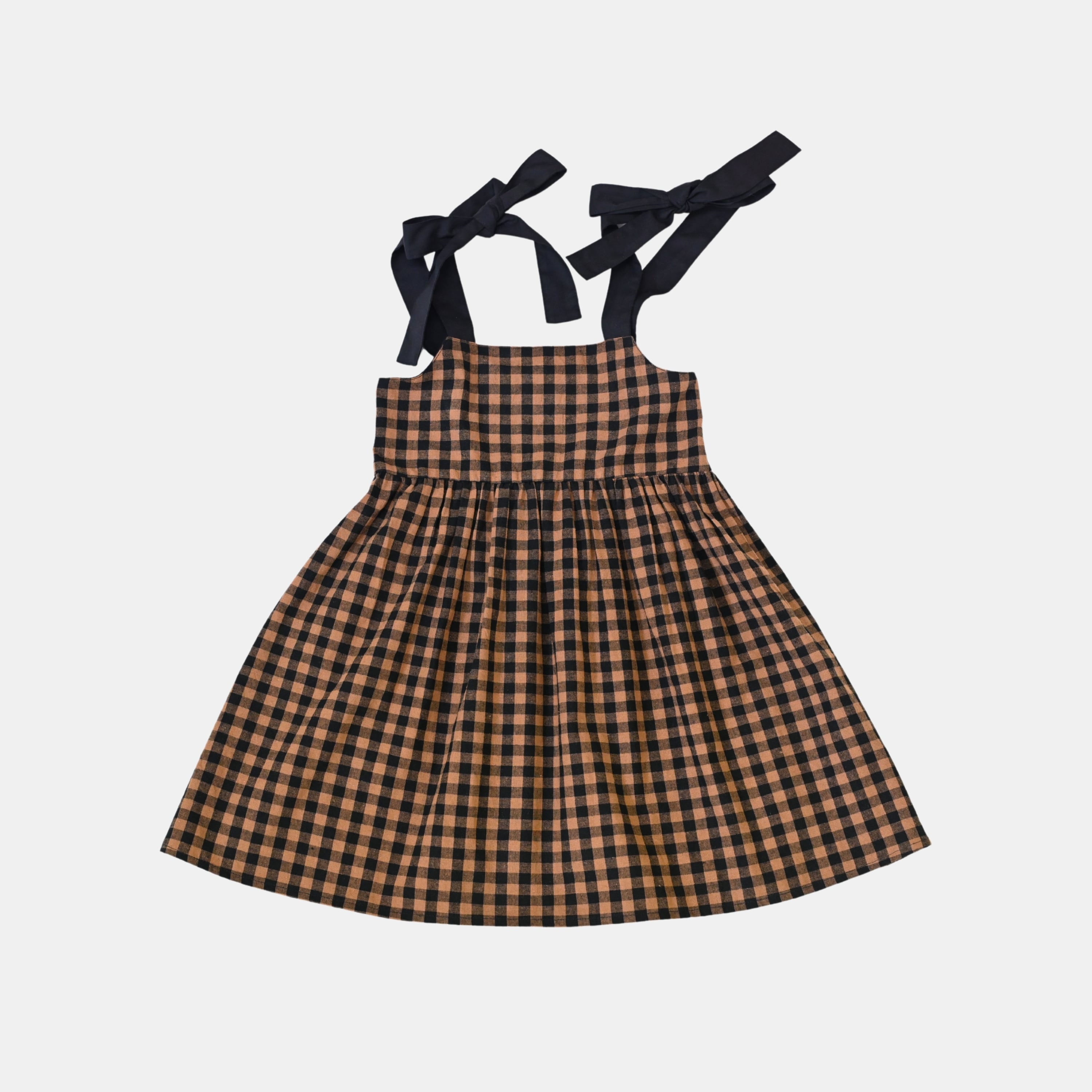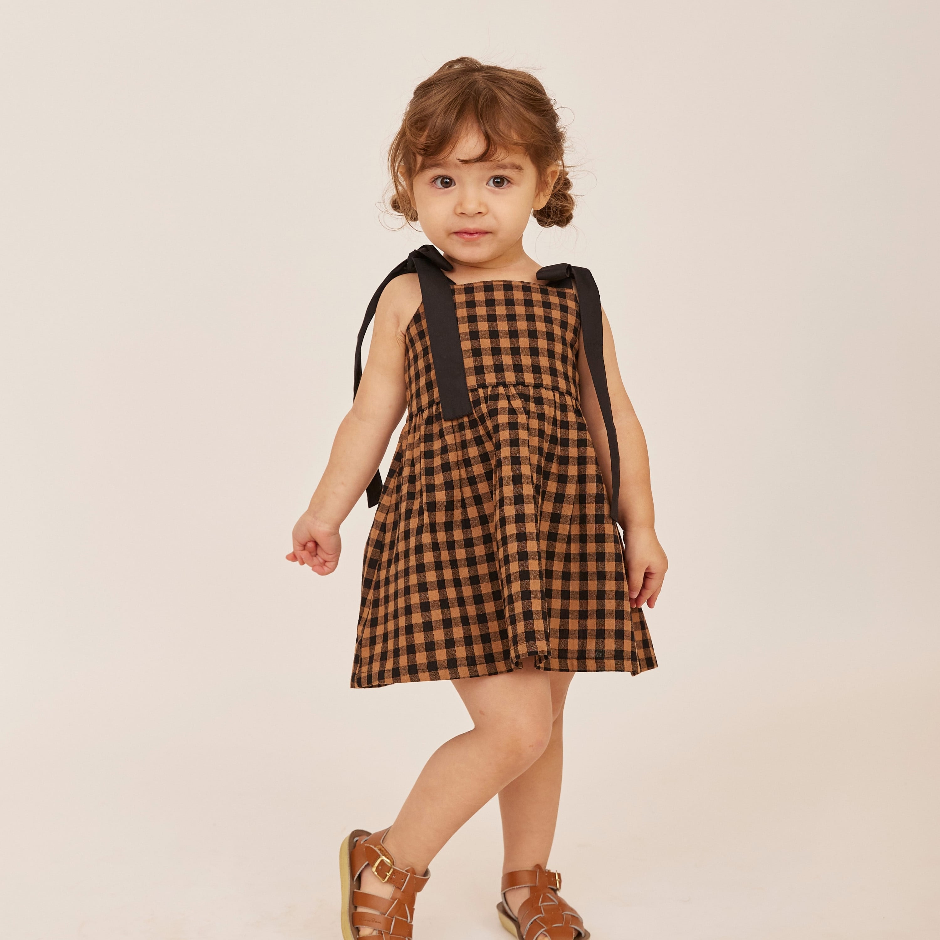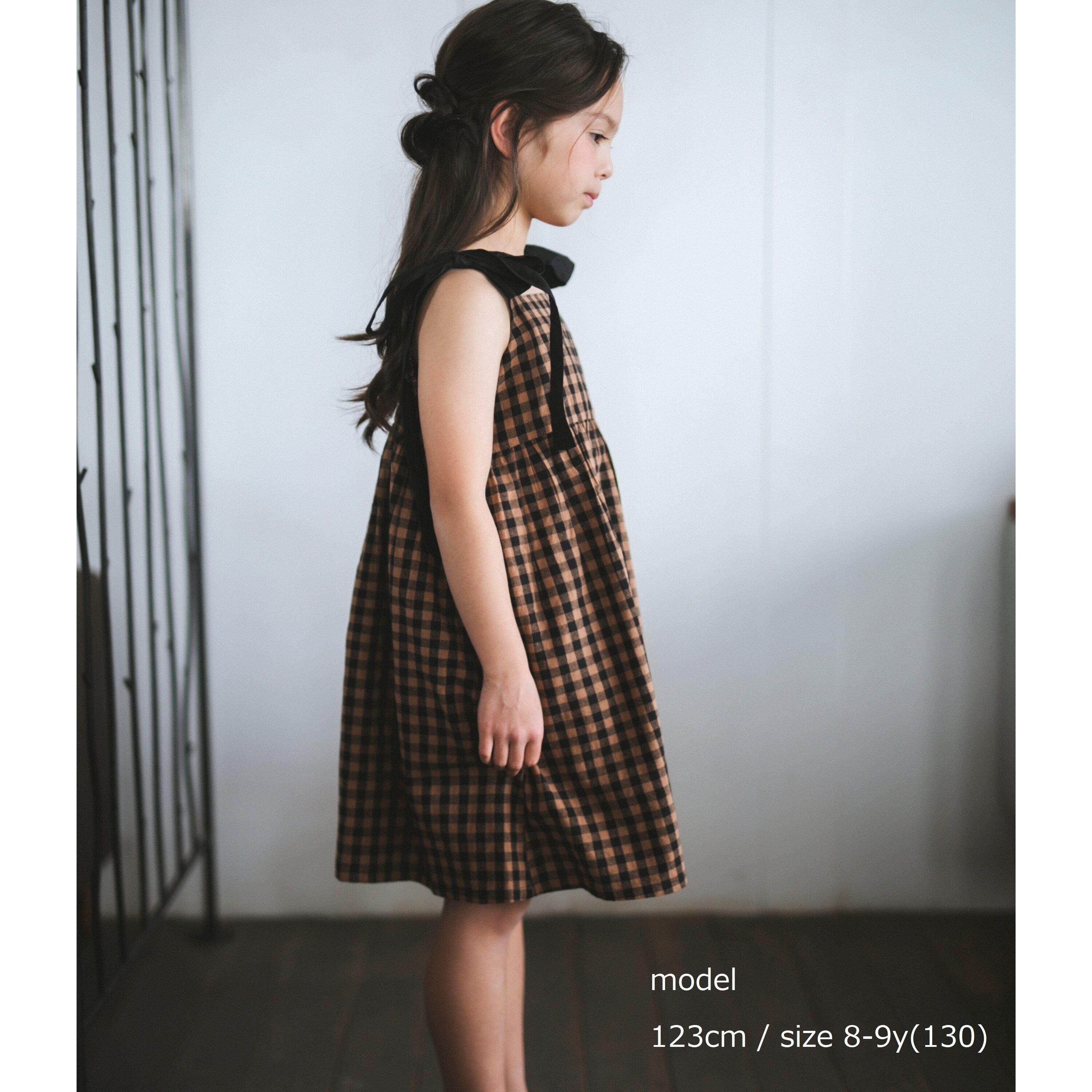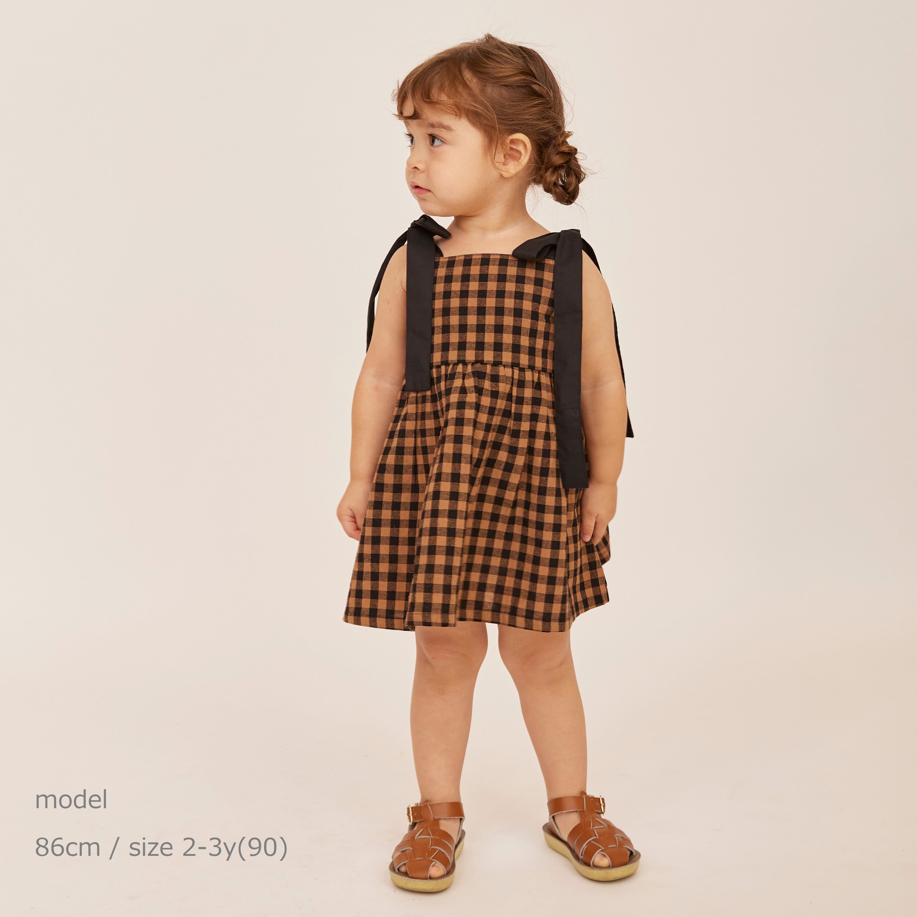 肩のリボンがアクセントになったギンガムチェック柄ワンピース。リボンは結び直しができ、成長に合わせて長く着られます。背面はゴム仕様で着脱もしやすくフィット感も動きやすさもかなえてくれます。クラシカルな配色が上品な印象の一枚です。