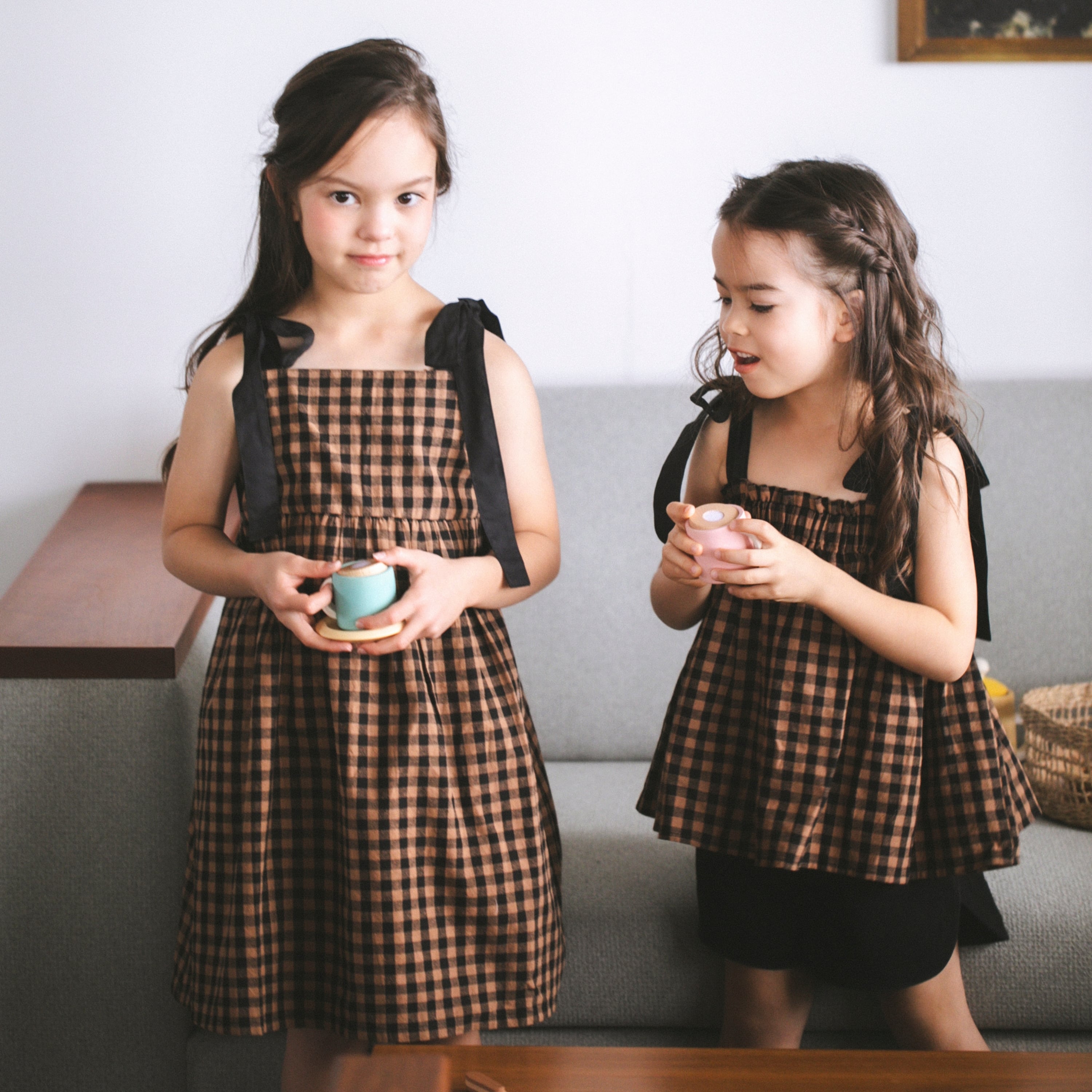肩のリボンがアクセントになったギンガムチェック柄ワンピース。リボンは結び直しができ、成長に合わせて長く着られます。背面はゴム仕様で着脱もしやすくフィット感も動きやすさもかなえてくれます。クラシカルな配色が上品な印象の一枚です。