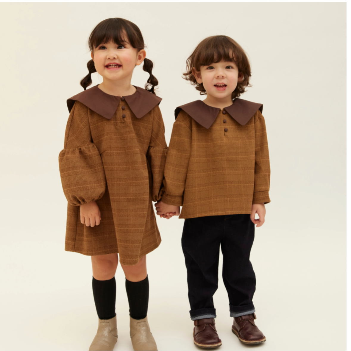 兄弟姉妹お揃いで楽しめる、高級感あふれるグレンチェック柄のシャツとワンピースが登場。
